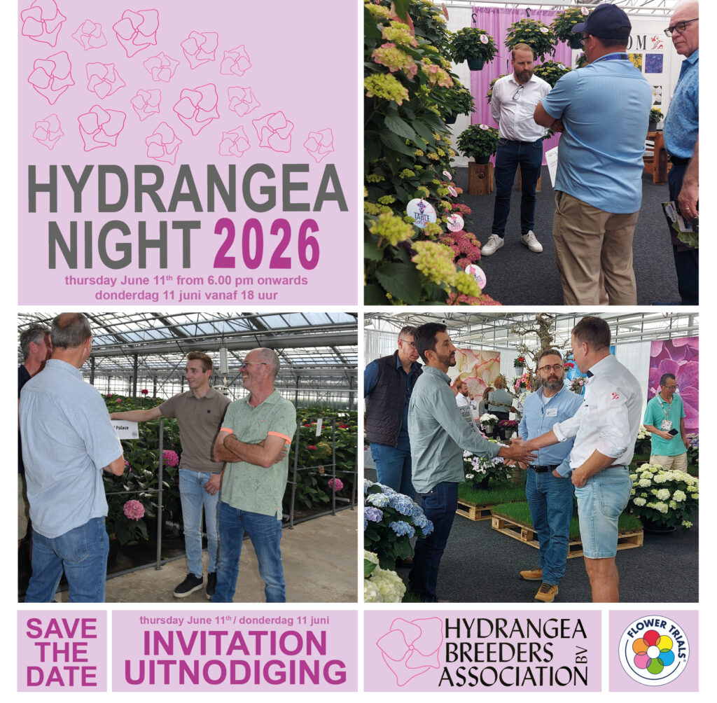 De Kwakel, April 2024 – We are looking forward to the Flower Trials 2026. During this event in week 24, HBA wil host the HBA HYDRANGEA NIGHT (by invitation only, registration required) on thursday evening, june 11.